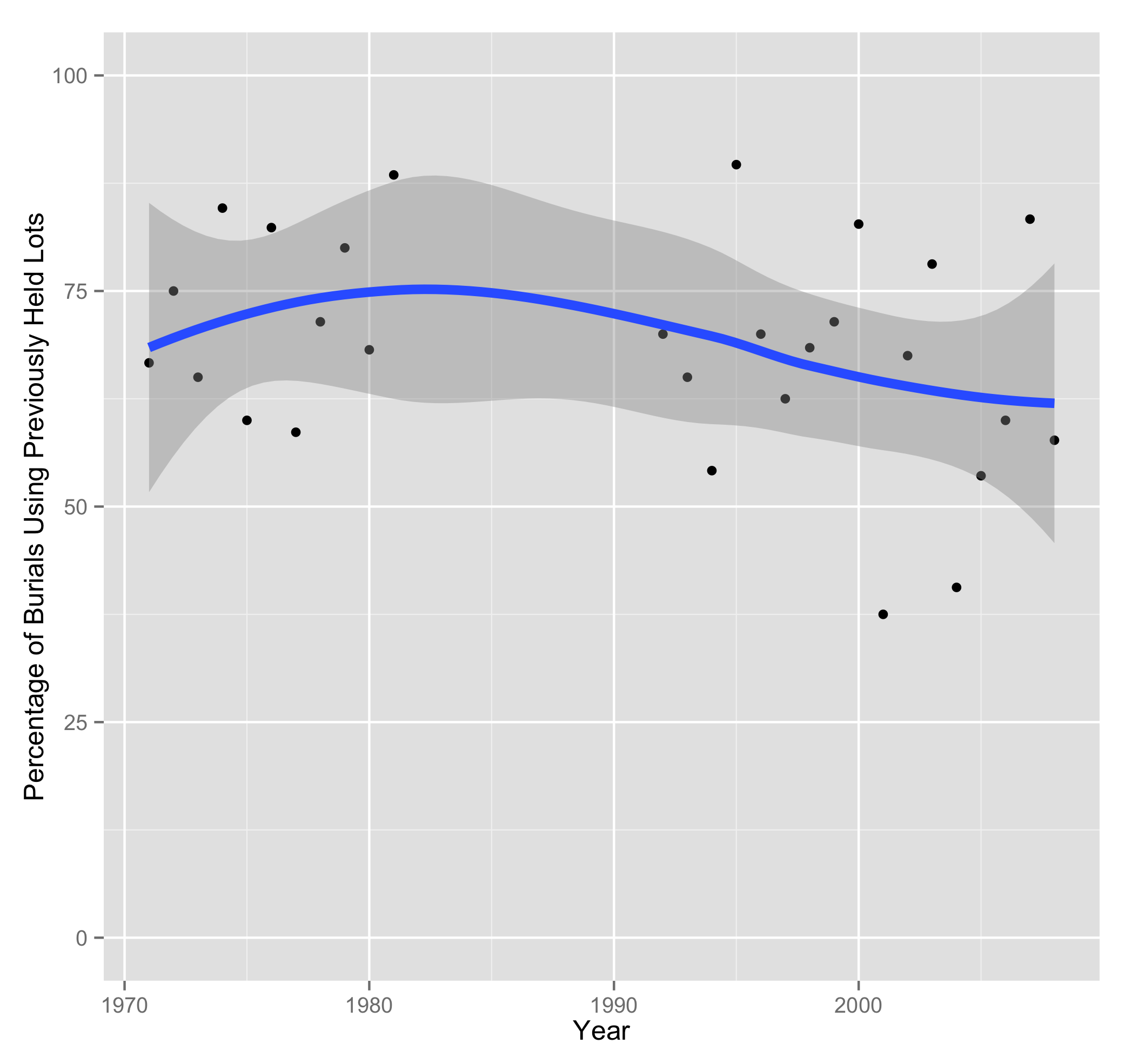 Percentage of Amherst cemetery burials using previously held (perpetual care) lots. Note that this is a lower bound because we are assuming that lot sales go to immediate burials and not to perpetual care.