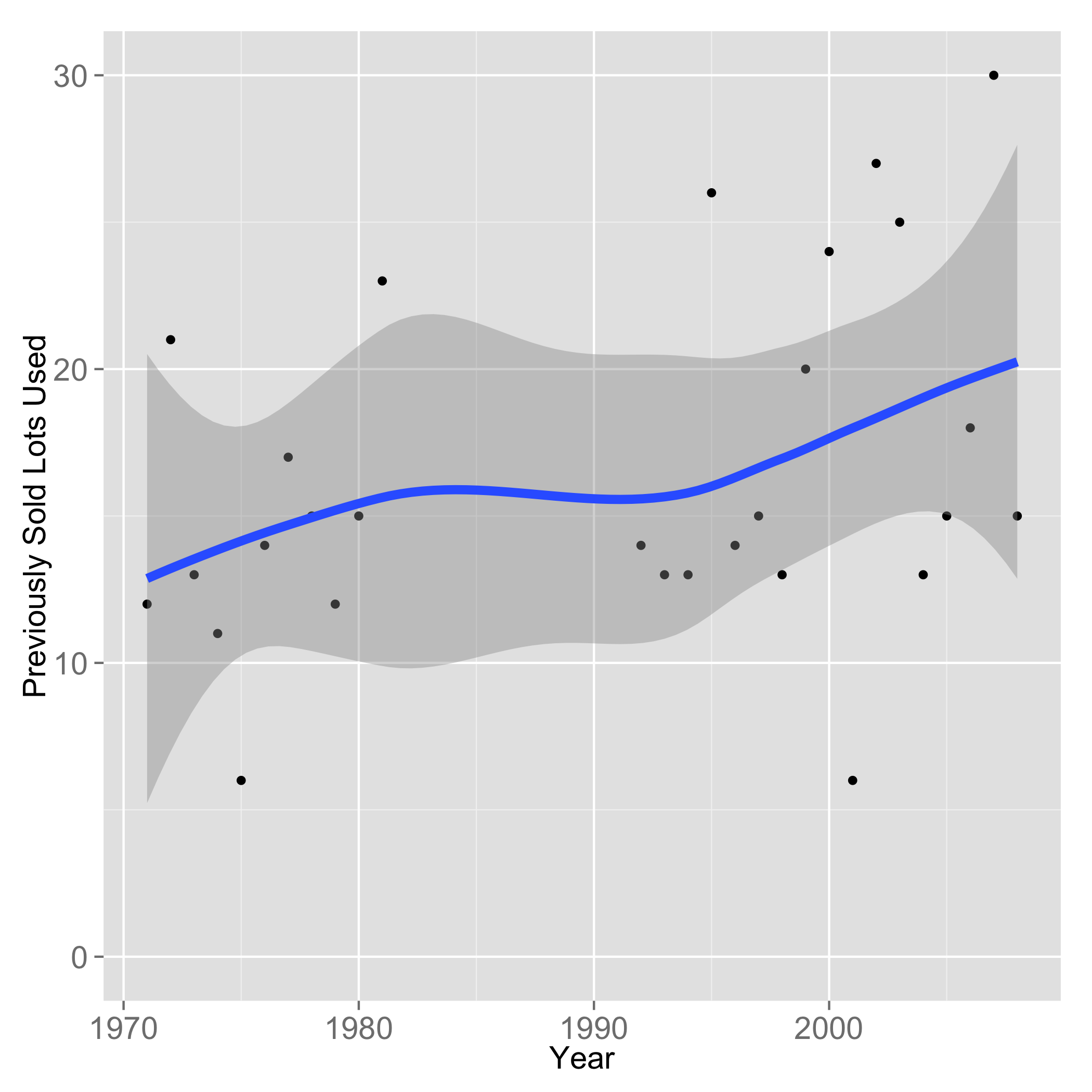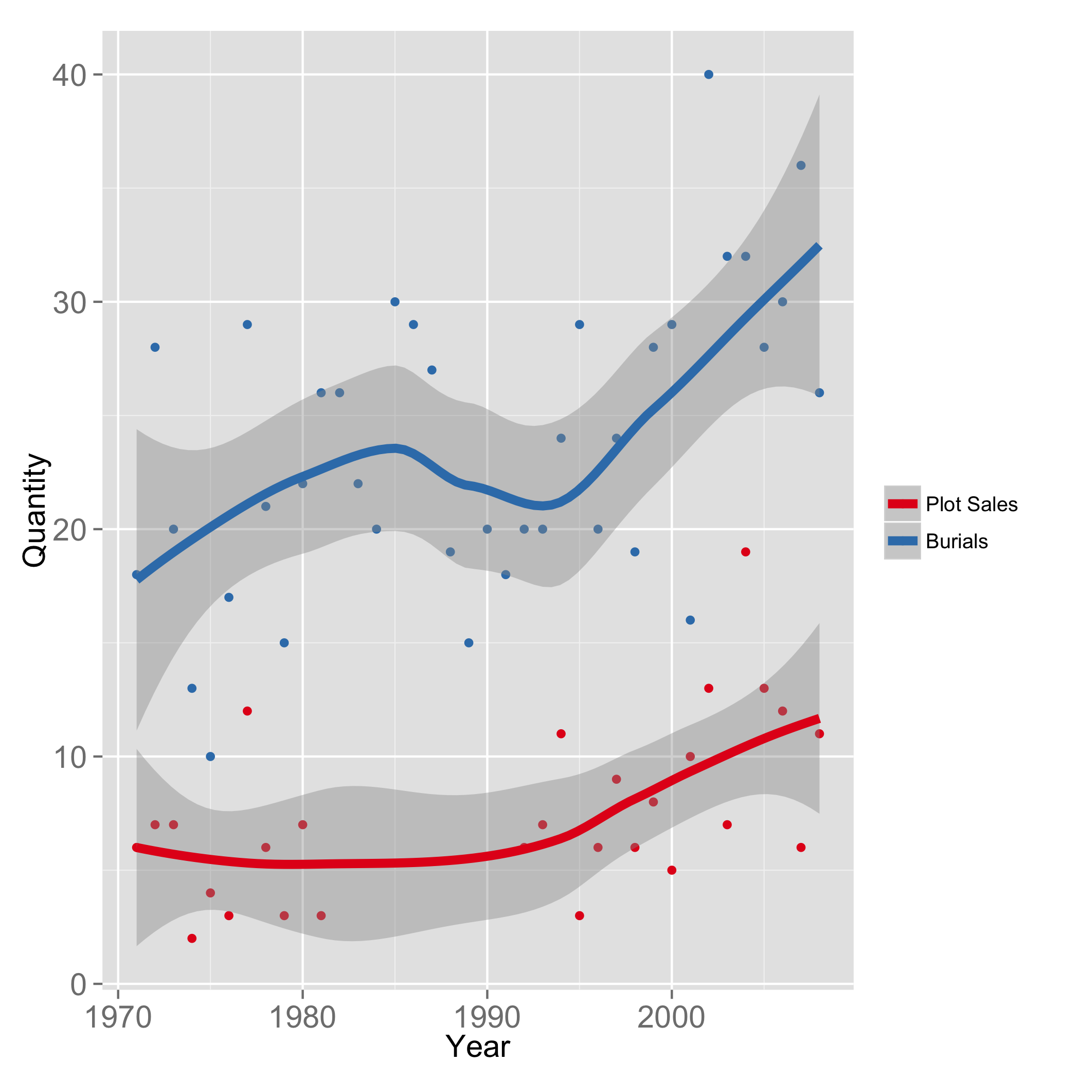 The graph below plots burials in Amherst cemeteries (in blue) during the years for which I was able to obtain lot purchase data (1971-2008), and also the lot sales data (in red). Note the 1982-1991 lapse in red points on the graph – the missing record years. It is, I think, reasonable to assume the trend bridging the gap here. In any case, the sale of new lots is a surprisingly small number, with the average over more than three decades being 7.6 cemetery lots sold per year.