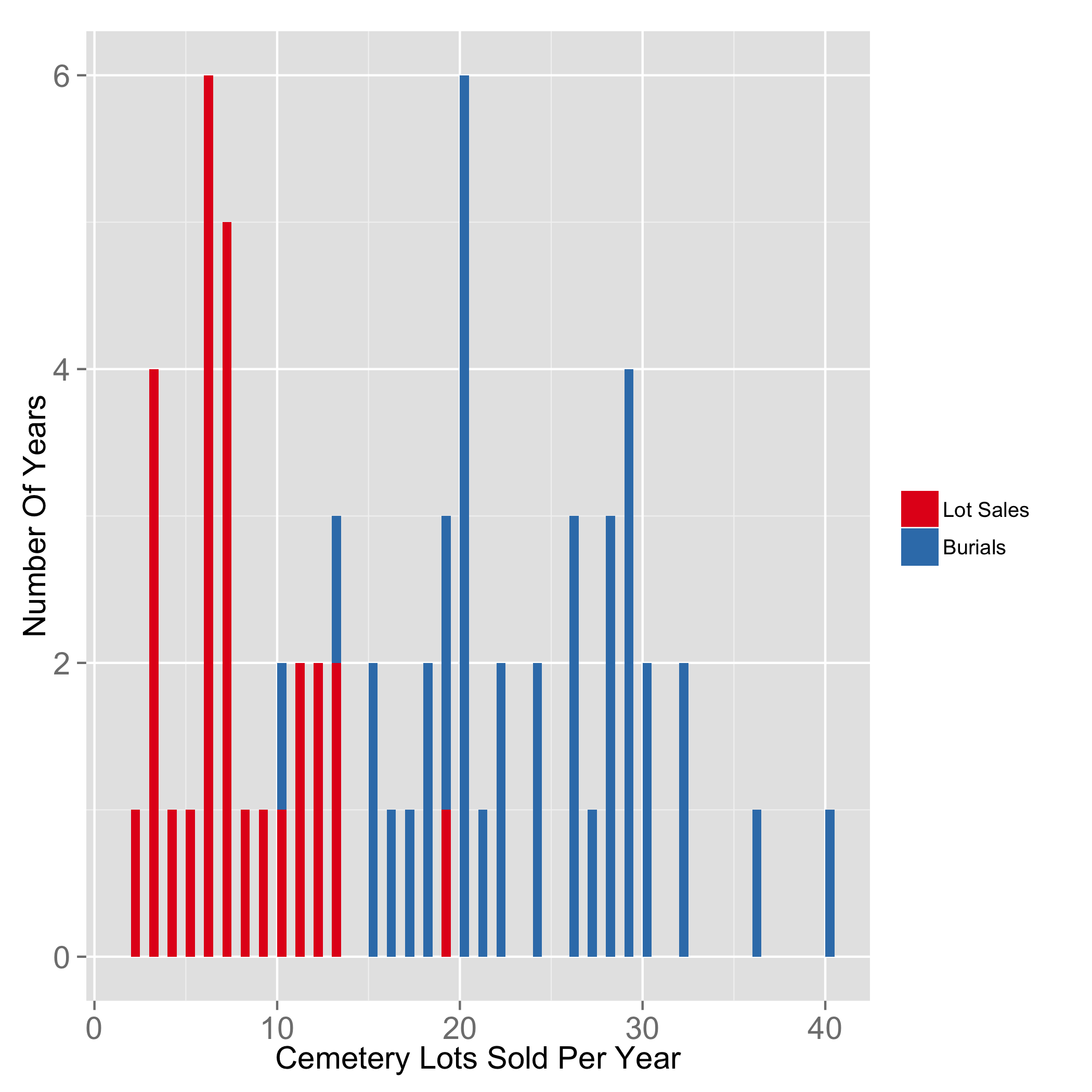 If you are the sort of person who sees value in histograms, we can view it that way too. If you aren’t used to histograms, what this shows is a count of how many times each number shows up in each set. In other words, how many years there were sales or usage of a given number of burial lots. You can see that there were six years where six lots were sold (red), and also six years where 20 lots were used (blue) and each set peaks very close to its average lots/year value (7.6 for lots sold, 22 for burials). This is just another illustration of the separation between the number of lots used and sold each year.