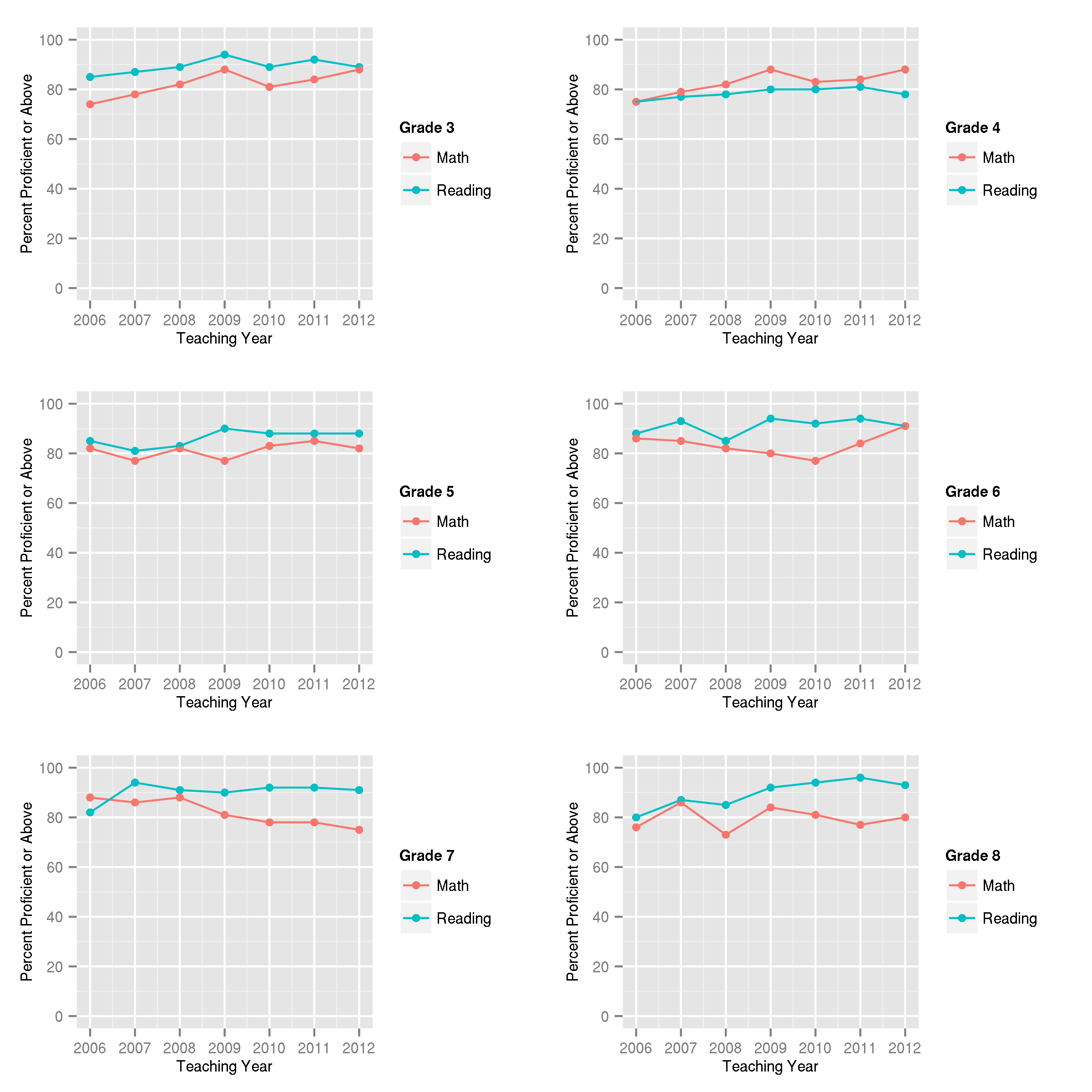 Below are the individual grade level NECAP testing results for math and reading for teaching years 2006 through 2012.  Plotted first are the percentage of students scoring proficient or above for grades 3-8.  (Note:  The NECAP test for teaching year 2006 is given in the Fall of 2007, etc.)