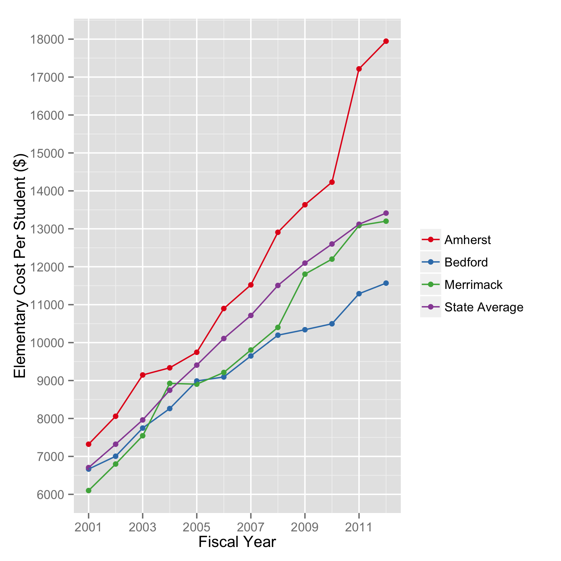 Luckily, the state Department of Education puts their numbers online. The state does the calculation somewhat different than you might expect as they remove certain budget areas like transportation and food service from the calculation. With that in mind, these are the state’s cost per student numbers for elementary school education in Amherst, Bedford, Merrimack, and the state average as reported by the NH DOE from 2001-2012.