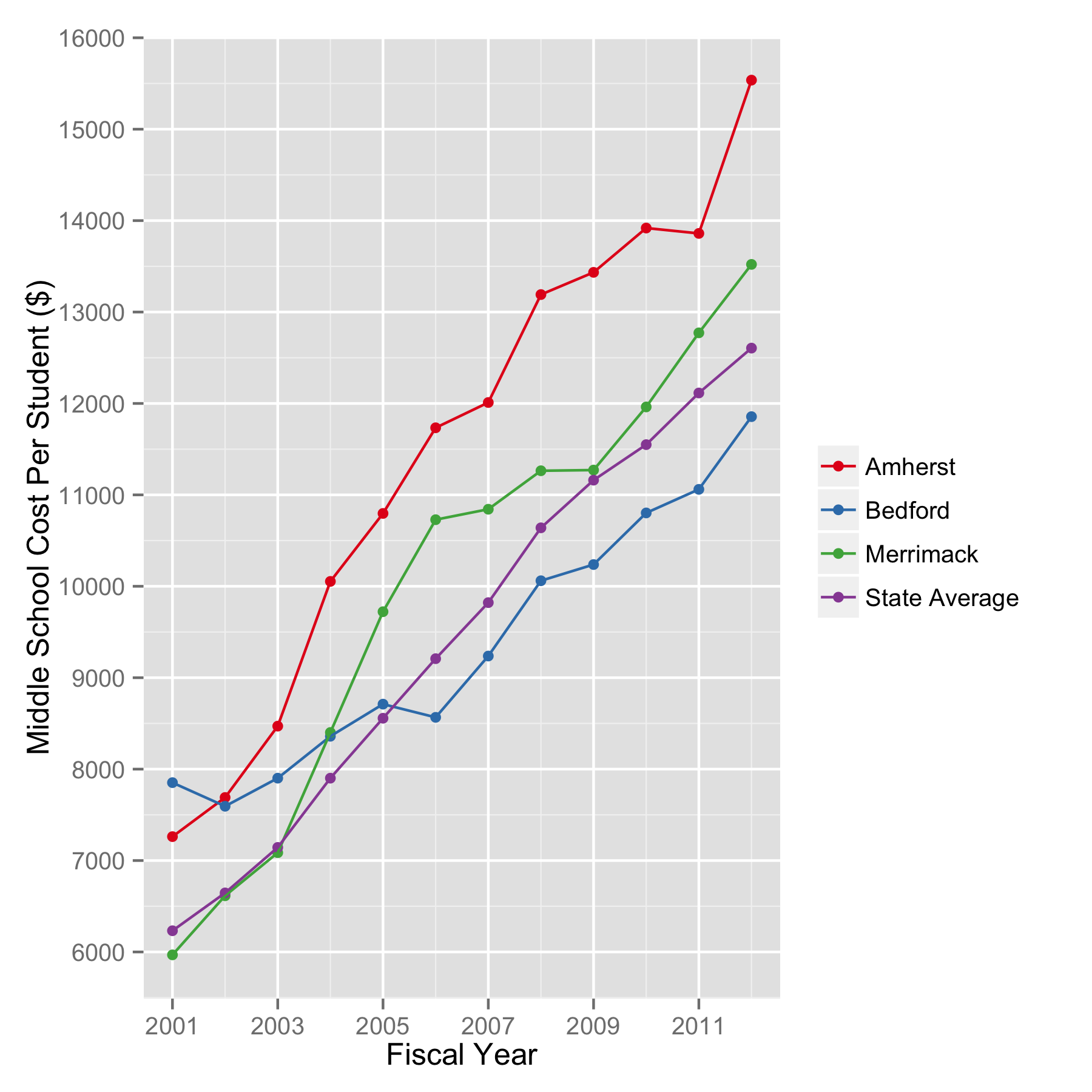 So according to the state, in FY 2012 we outspent the state average by $4533/student, Bedford by $6378/student, and Merrimack by $4745 in elementary school education. Go back and read that again. I found this to be remarkable. And a little surprising. We need to understand why Amherst’s numbers are so very different from our neighboring towns. Those other New Hampshire towns have the same health insurance and NH Teachers Retirement fund constraints that we do, so those probably aren’t the drivers.