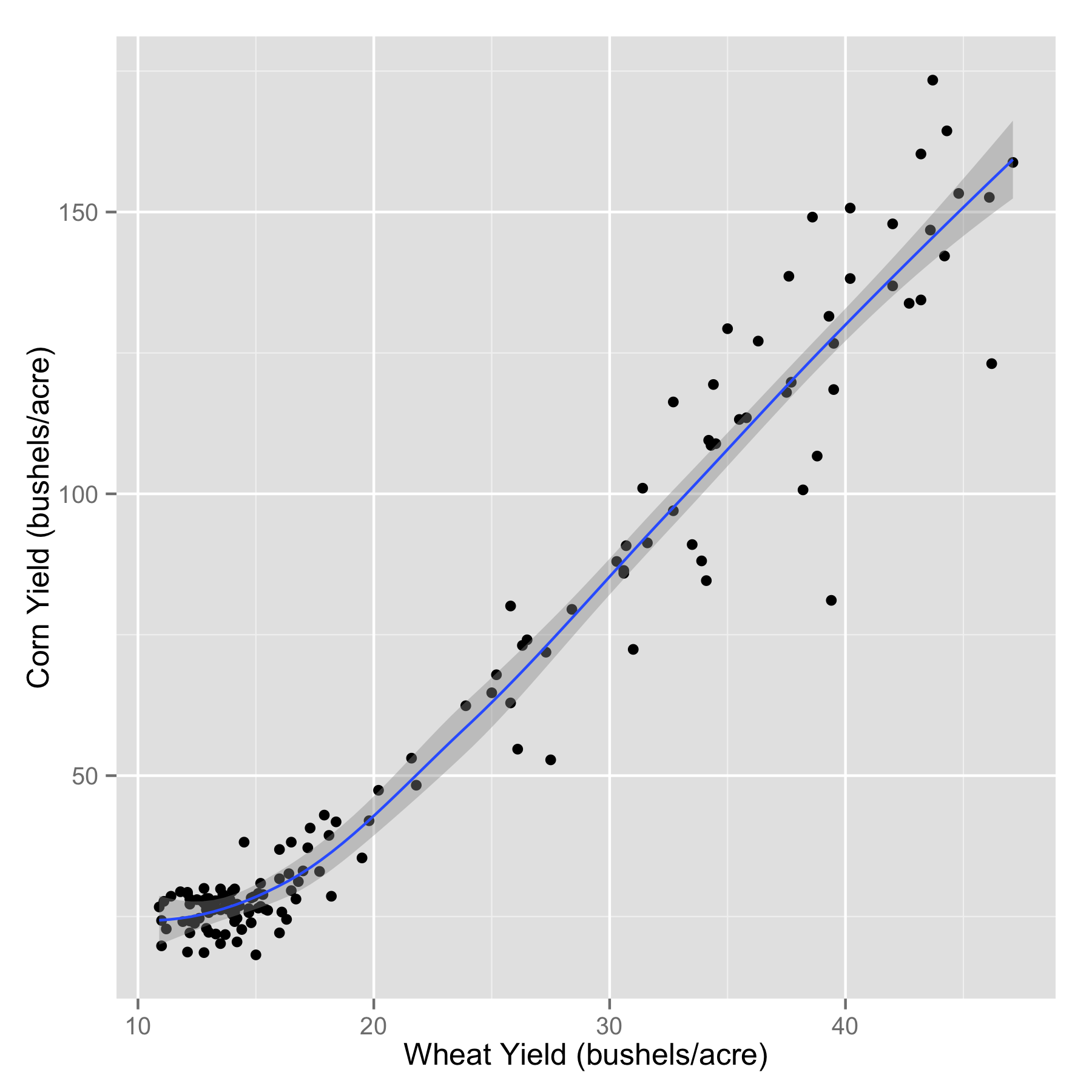 We can look at this another way, by plotting the corn yield against the wheat yield. And what we see is that the relationship is well behaved. When wheat yields increase, so do corn yields, though not necessarily in the same proportion. After a point, every 10 bushels/acre growth in wheat equals about a 40 bushel/acre growth in corn. This suggests there is more to the story — that there is some common factor that drives this effect.