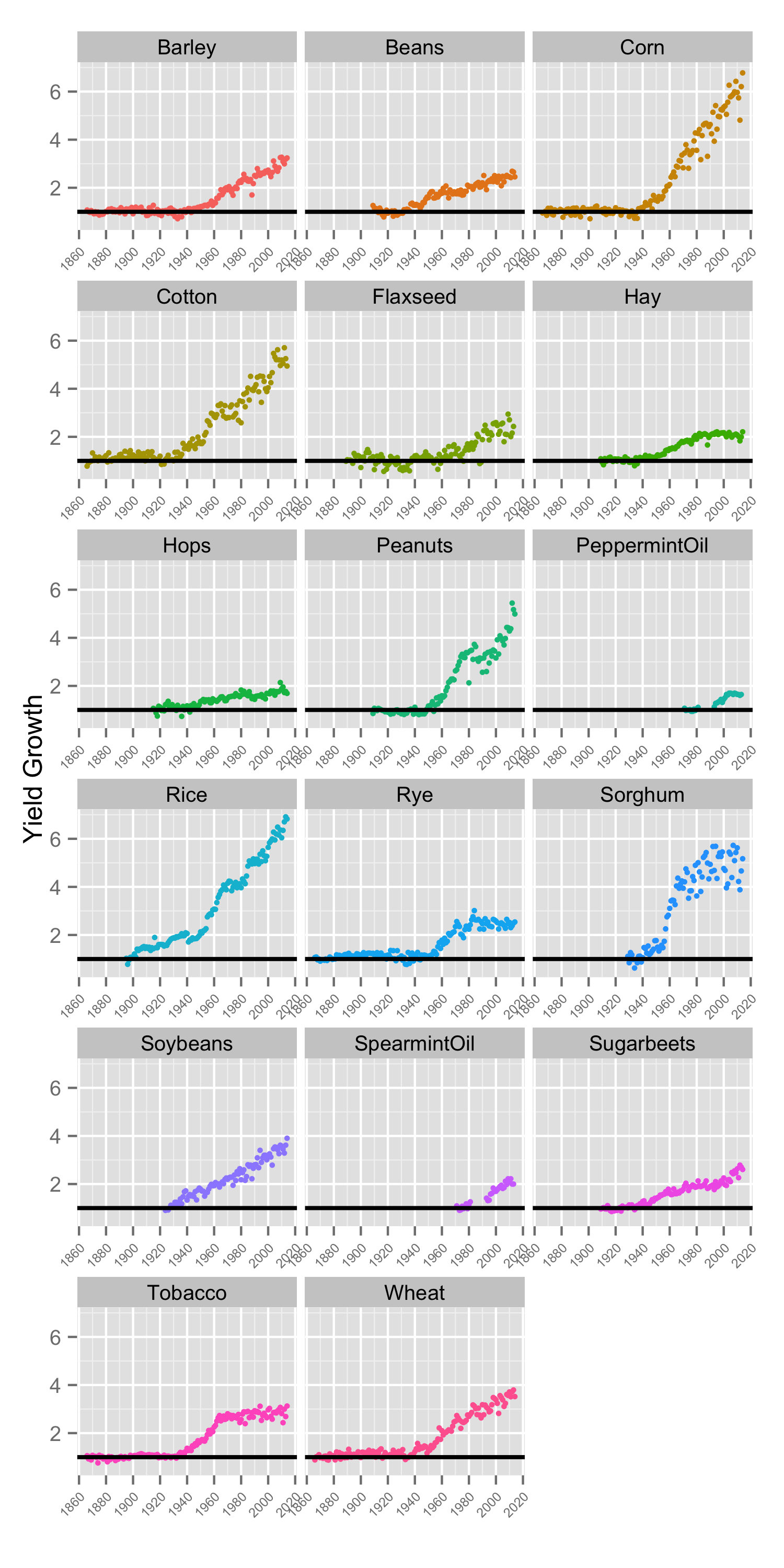 Yield growth in US field crops. Plotted is the multiplier in the yield rate since the start of data collection for the given field crop.