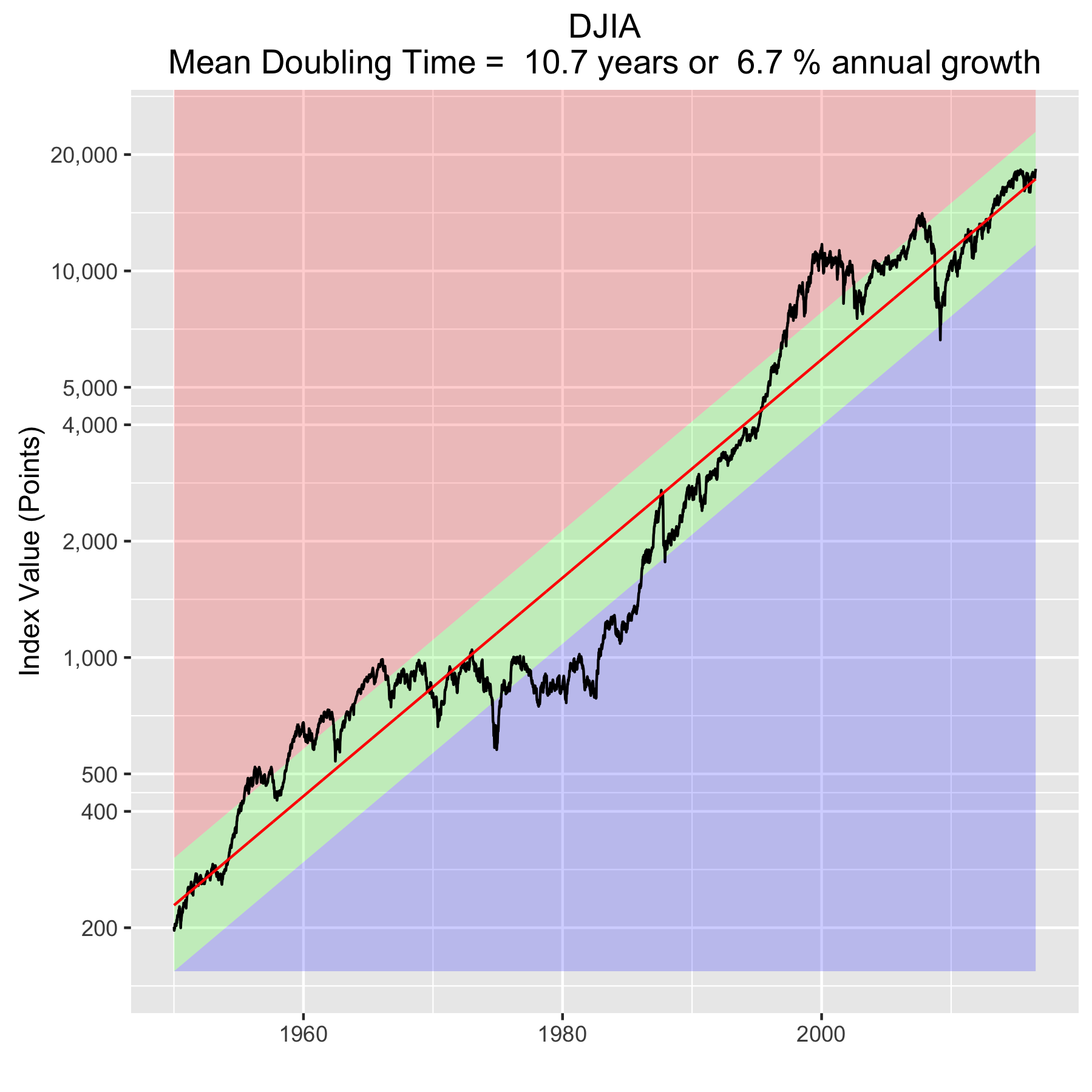 The doubling time is the how long it would take for an index’s value to double. The larger the growth rate, the smaller the doubling time. Note that this effect will happen almost 3.5 years sooner for a NASDAQ fund than for a DJIA fund. This, then, is where rubber meets road.