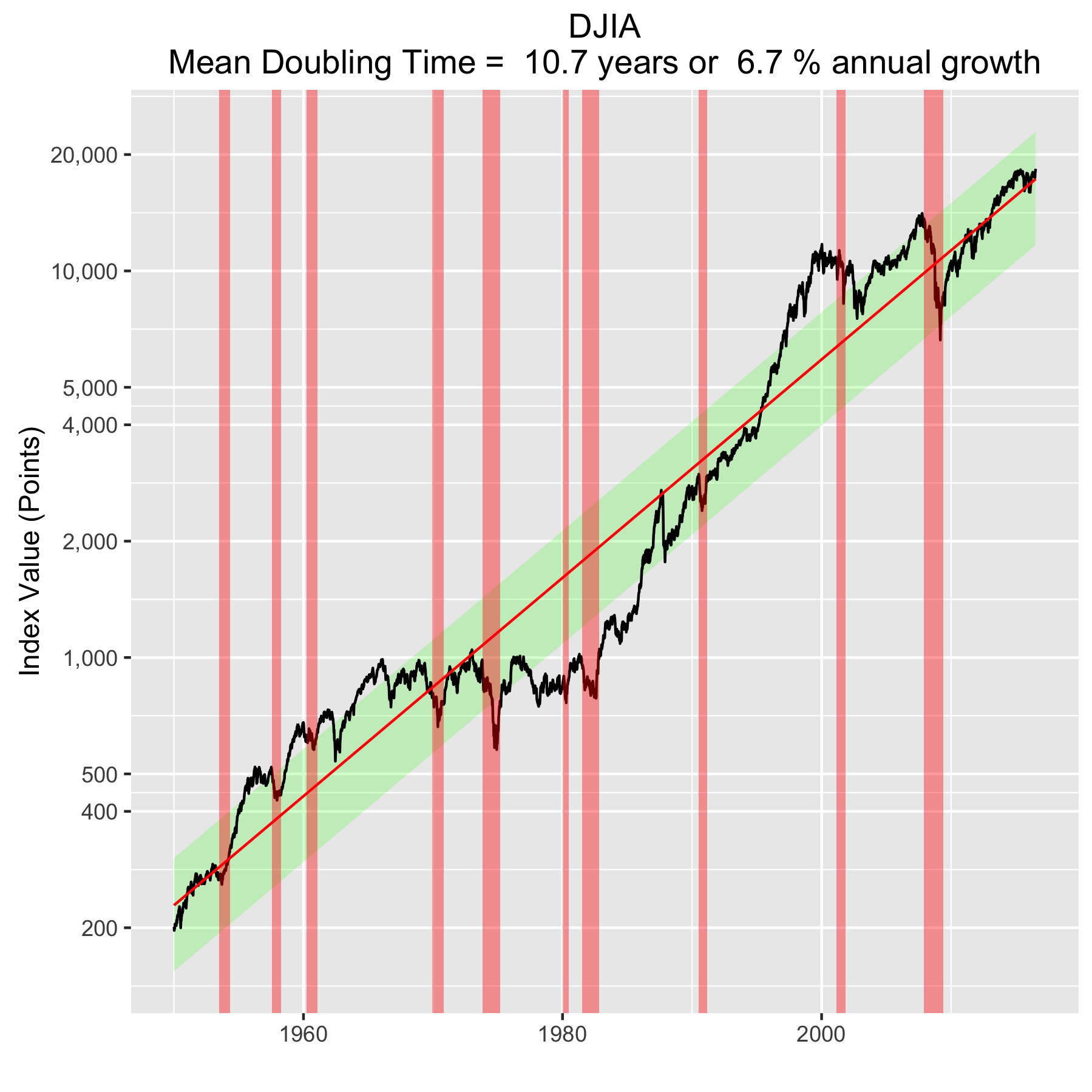 There are plenty of other mini crashes – sharp drops in value due to economic recession. The St. Louis Federal Reserve Economic Database (FRED) lists the dates of official economic recession for the US economy. Overlaying those dates (light red vertical bars) onto the Dow Jones plot shows what happens to the index value during economic recession, and what happens after. This is typically a return to a value close to what it was before.
