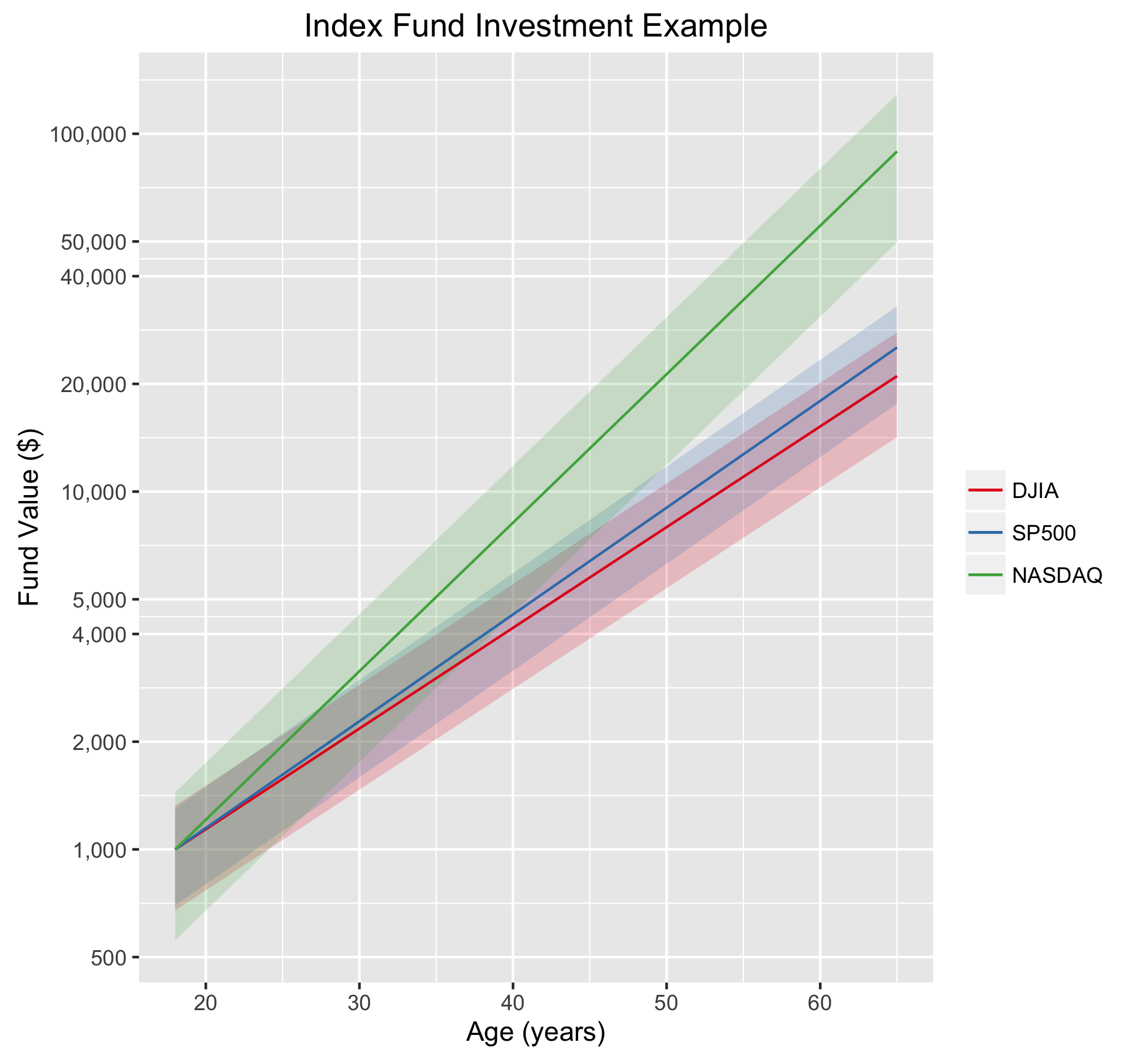 Doing the math, we see that we should expect the DJIA investment at age 65 to be fall roughly between $14,000 and $28,000 (a standard deviation of $6700), the S&P 500 to fall between $17,500 and $32,000 (a standard deviation of $7500), and the NASDAQ to be between $49,000 and $125,000 (a standard deviation of $38,000). Certainly the NASDAQ fund’s variation is quite large, but note that even the low side of the NASDAQ fund’s projected value is still almost double that of the DJIA’s best outcome.