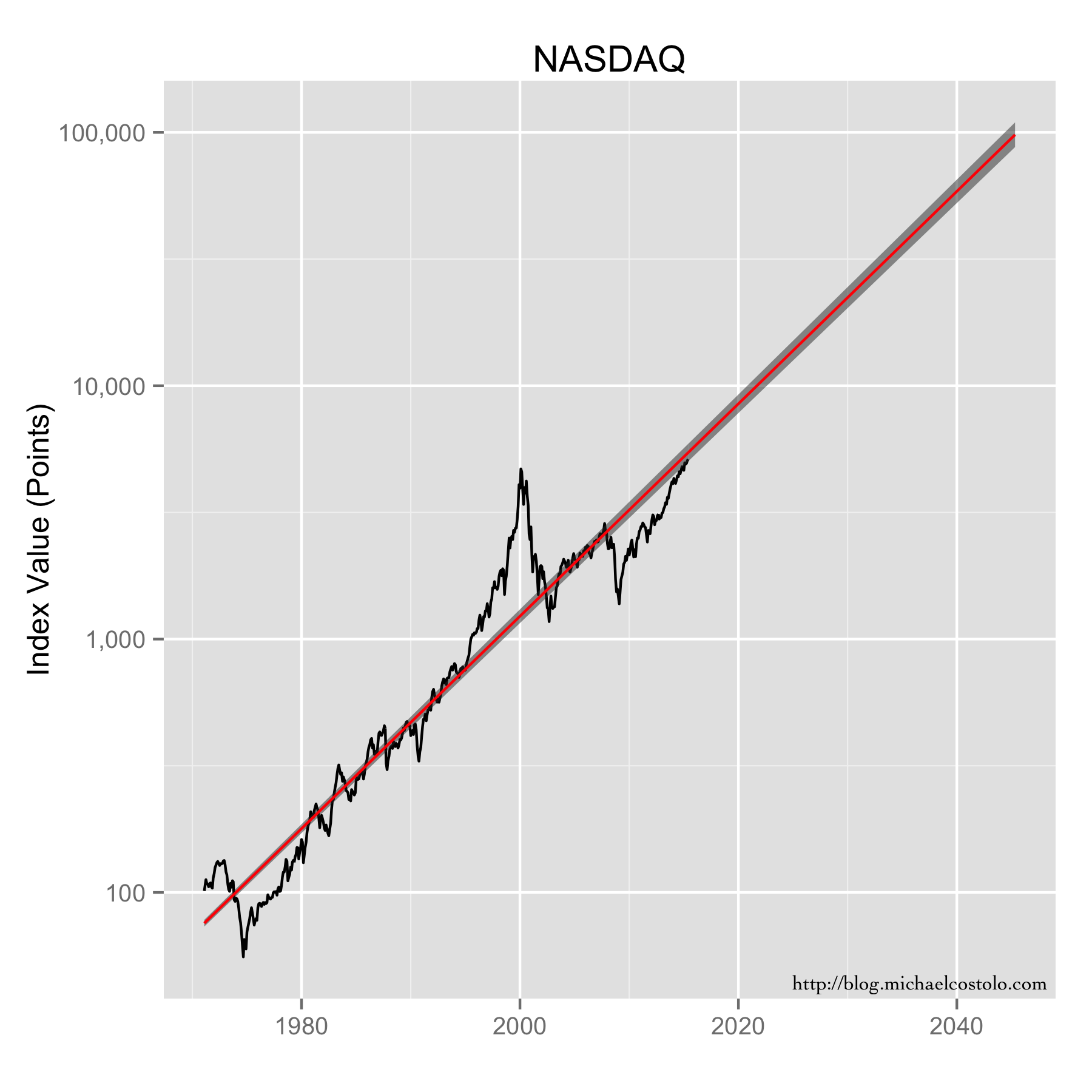NASDAQ data, along with its exponential model fit, extended out thirty years. The grey area represents the confidence intervals.