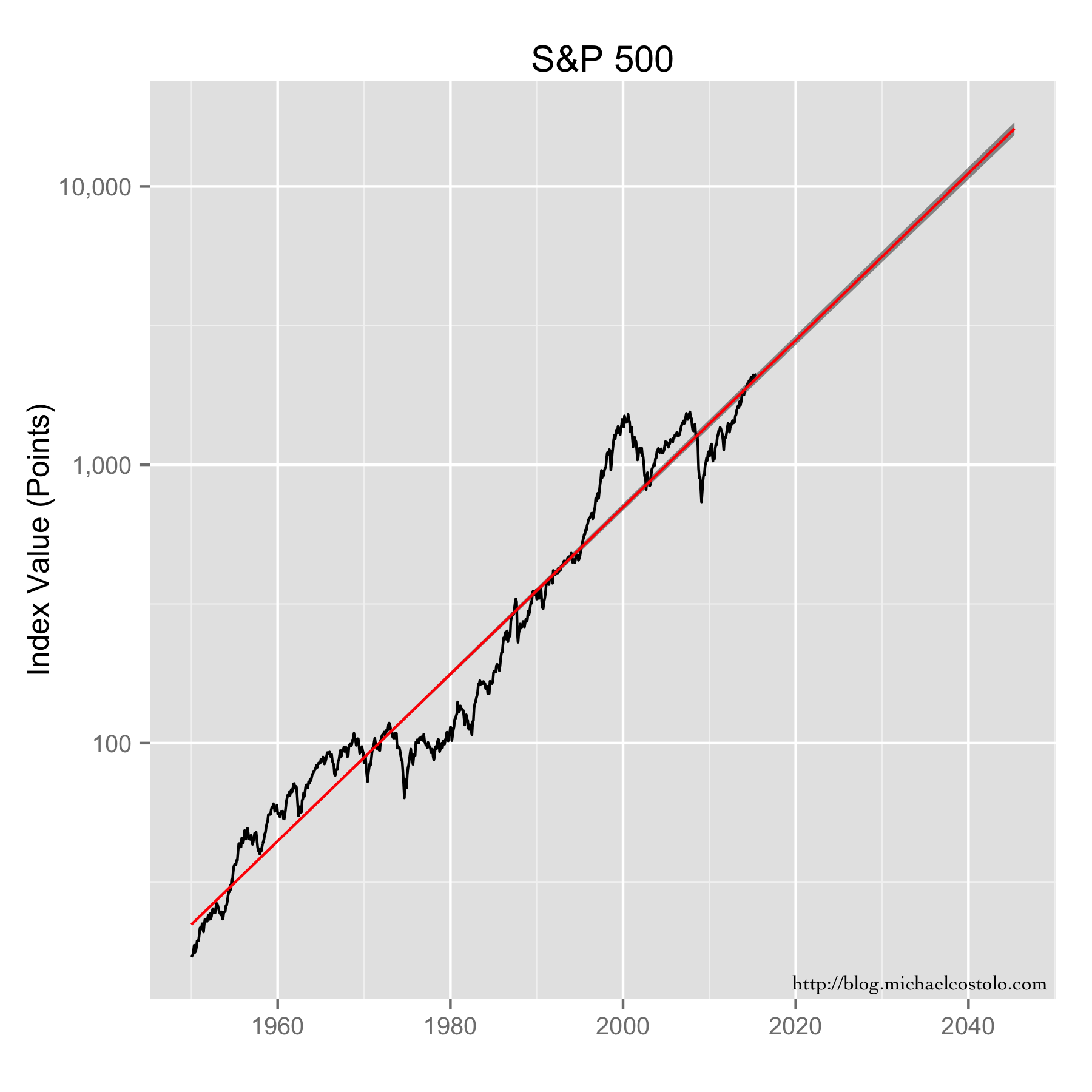 S&500 data, along with its exponential model fit, extended out thirty years. The grey area represents the confidence intervals.