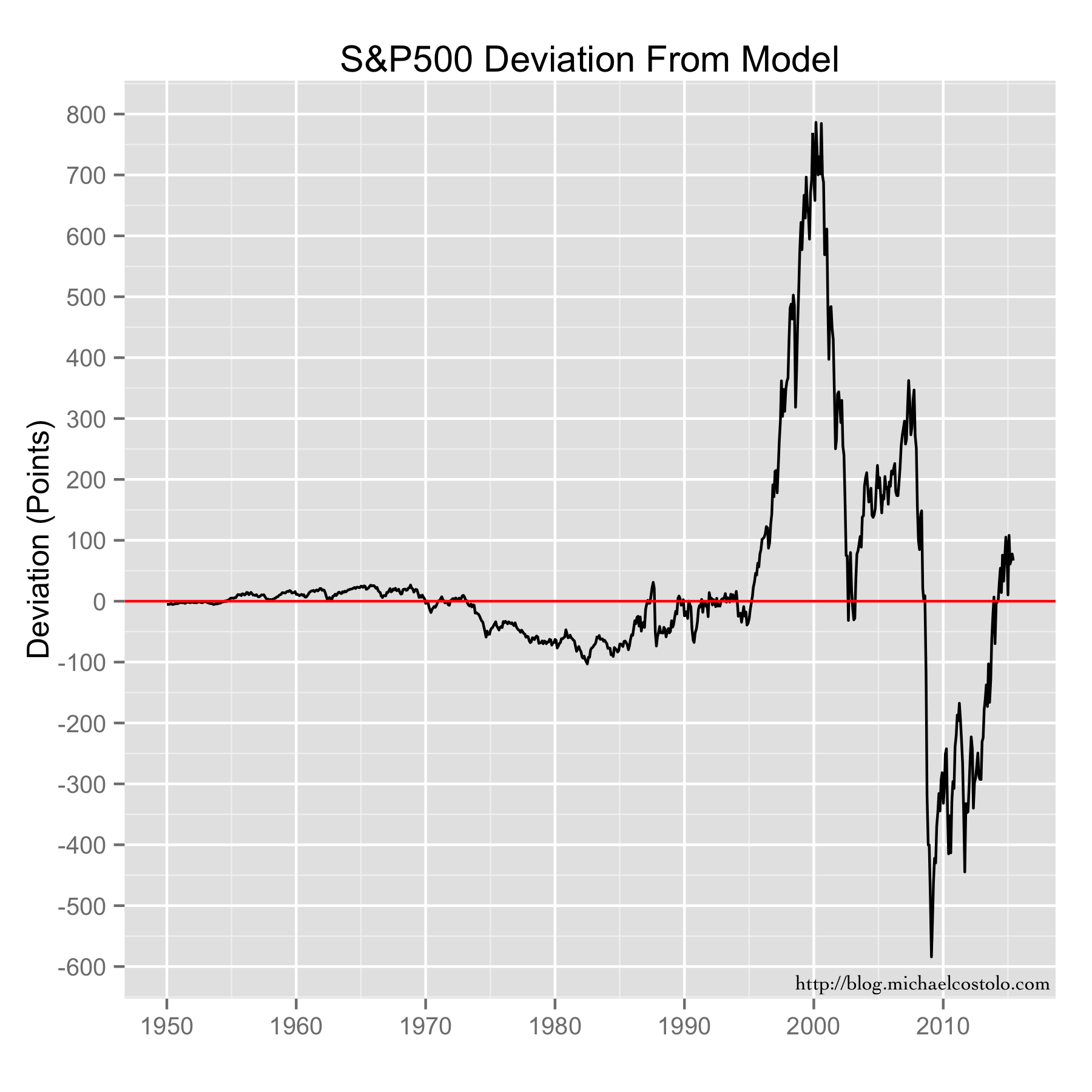 This return to the line is a little bit clearer if we plot the difference between the index and the trend. This would seem to be a reasonable way to spot overvalued or undervalued markets. Meaning, that in 2000, when the S&P was some 800 points over its long term model value, the corresponding rapid drop back down to the line should have caught no one by surprise.