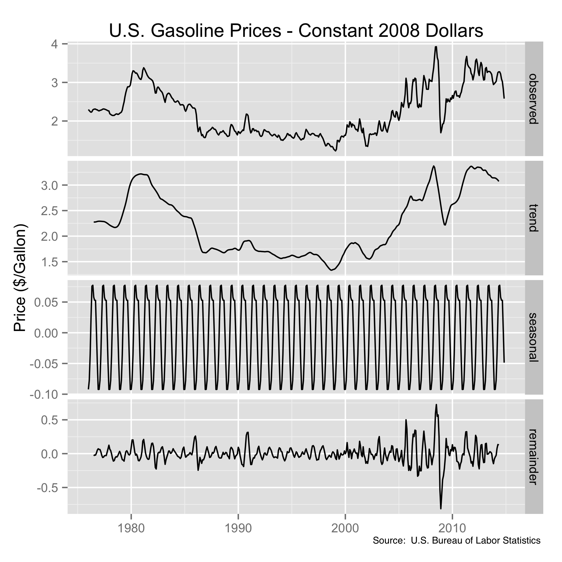 Non-seasonal, August to November changes in U.S. regular unleaded gasoline prices from 1976 to 2013. The comparison is made for election and non-election years. Original data source is the U.S. Bureau of Labor Statistics.